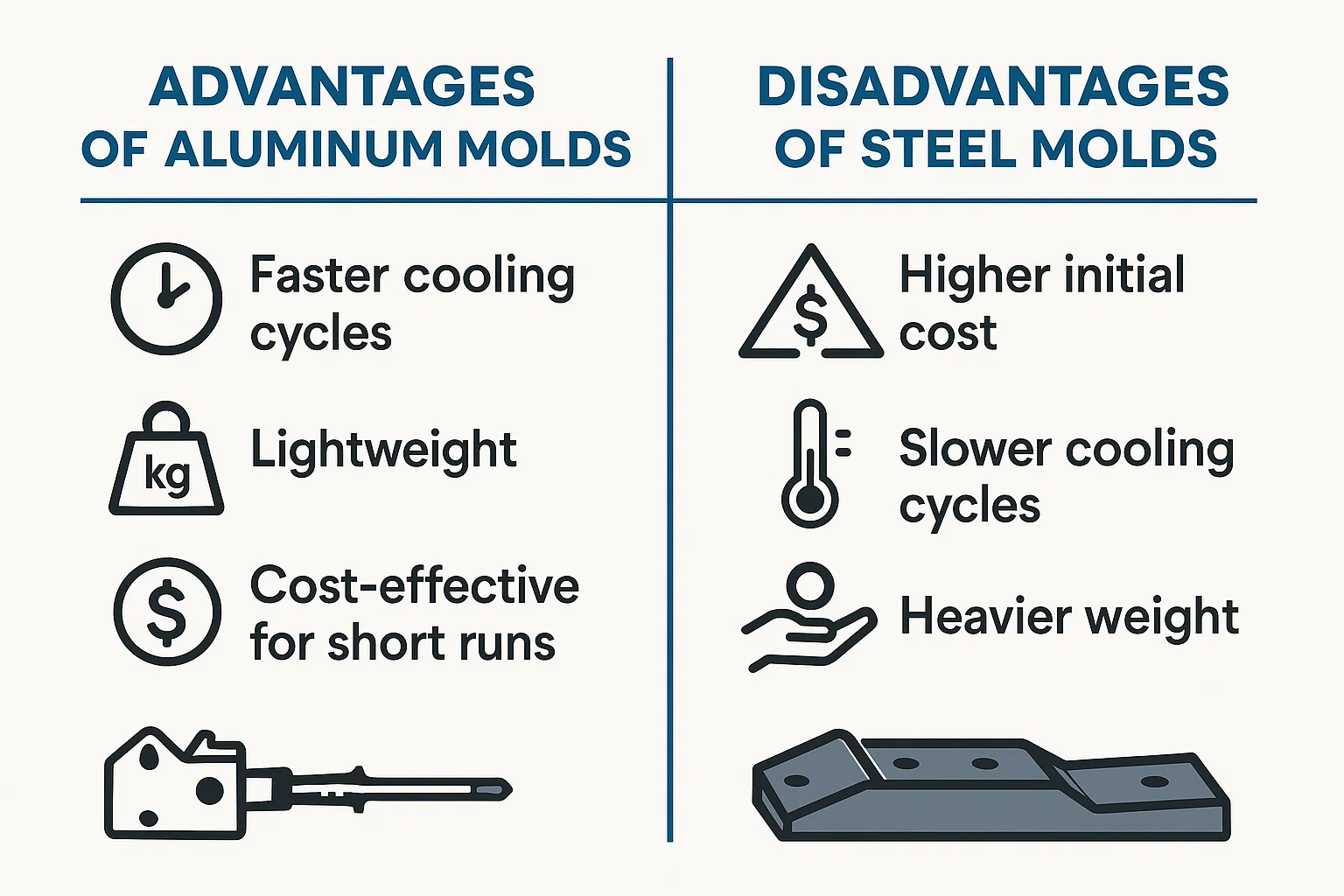 Långsammare kylcykler: Ståls lägre värmeledningsförmåga innebär att den behåller värmen längre. Detta förlänger kyltiden för varje del, vilket leder till långsammare produktionscykler och reducerad utgång jämfört med en aluminiumform.