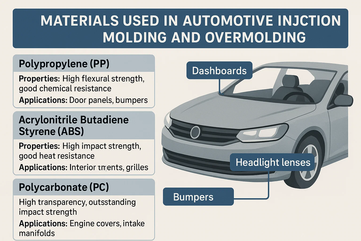Polypropylen (Pp): En lätt, billig plast med utmärkt kemisk resistens, vilket gör den idealisk för underhuv och inre applikationer.