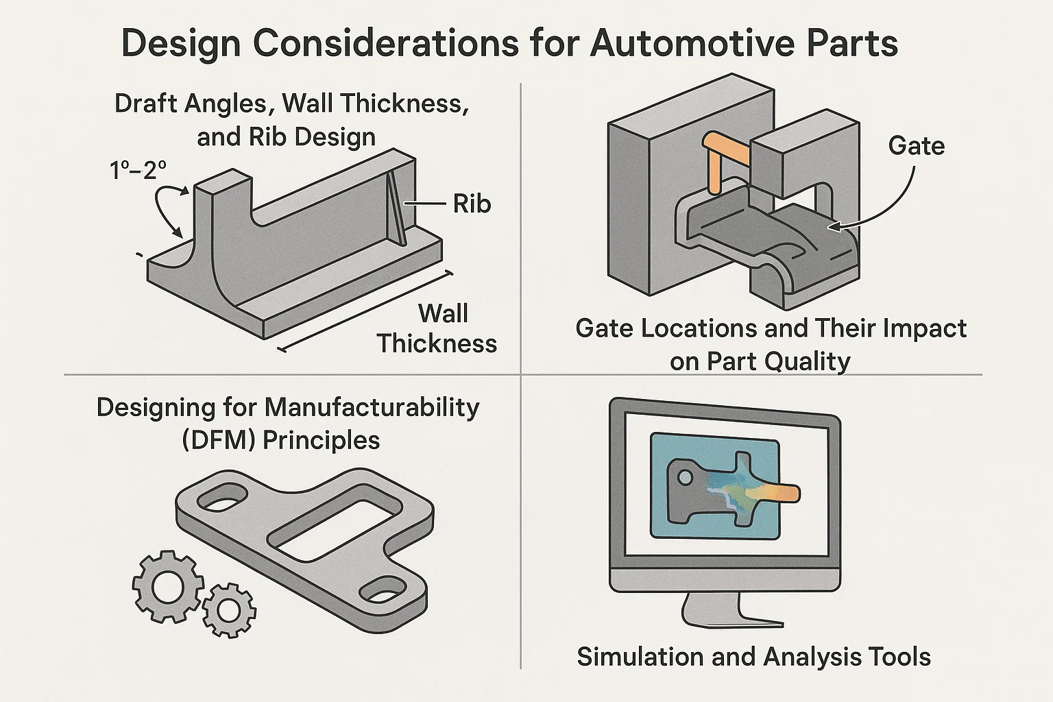 Framgången för formsprutade och övermjolerade fordonsdelar hänger på en noggrann designprocess. En väl utformad del är inte bara funktionell utan också tillverkbar, hållbar och kostnadseffektiv. Att följa grundläggande designprinciper är avgörande för att undvika vanliga problem som vridning, svaga bindningar och kosmetiska defekter.