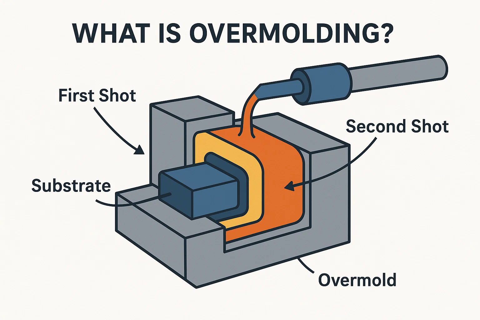 Overmolding är en sekventiell tvåstegsprocess där det andra materialet formas över en solid, befintlig del. Detta är idealiskt för att lägga till ett mjukt lager till en styv bas.