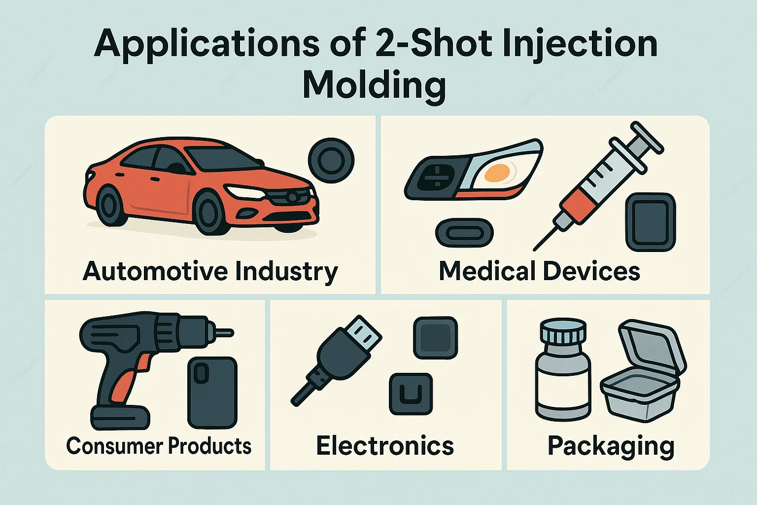 Den unika kombinationen av funktionalitet, estetik och effektivitet som erbjuds av injektion av 2-skott gör det till en föredragen tillverkningsmetod över ett brett spektrum av industrier. Dess förmåga att skapa en enda multimaterialdel i en cykel har löst komplexa design- och monteringsutmaningar, vilket leder till förbättrad produktkvalitet och prestanda i följande sektorer.