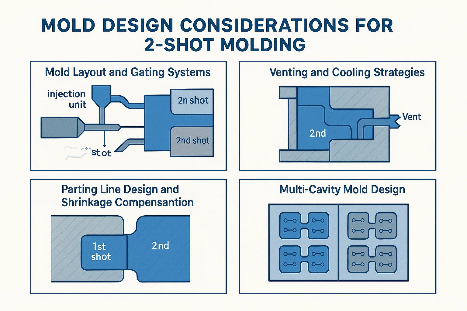 En mögel med 2 skott måste läggas ut för att innehålla två distinkta uppsättningar av hålrum: en för det första skottet och ett för det andra. De grindsystem —Kanalerna som riktar smält plast i hålrummen - är en kritisk del av denna design. Det finns två separata grindsystem, var och en matar från sin egen injektionsenhet. Konstruktionen måste se till att varje material riktas till dess avsedda hålrum utan korskontaminering.