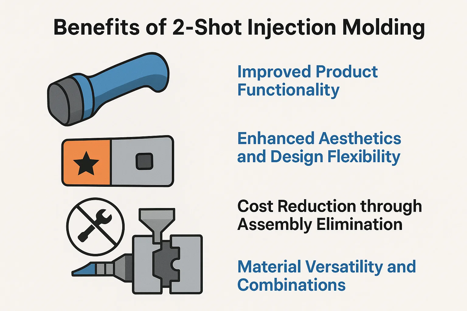 Det strategiska valet för att använda injektion av 2-skott går utöver enbart teknisk sofistikering; Det ger en mängd konkreta fördelar som dramatiskt kan påverka en produkts prestanda, kostnadseffektivitet och marknadsöverklagande. Genom att integrera två separata tillverkningssteg i en enda, sömlös process, löser 2-skottgjutning många av de utmaningar som är förknippade med multikomponentprodukter.