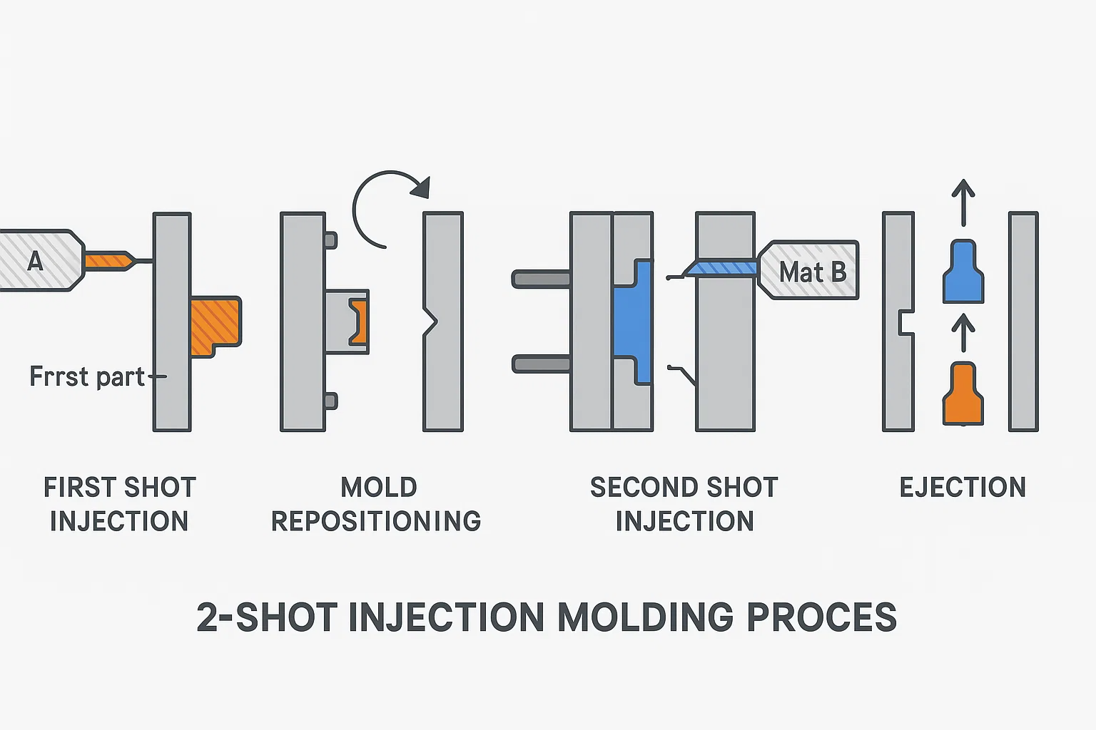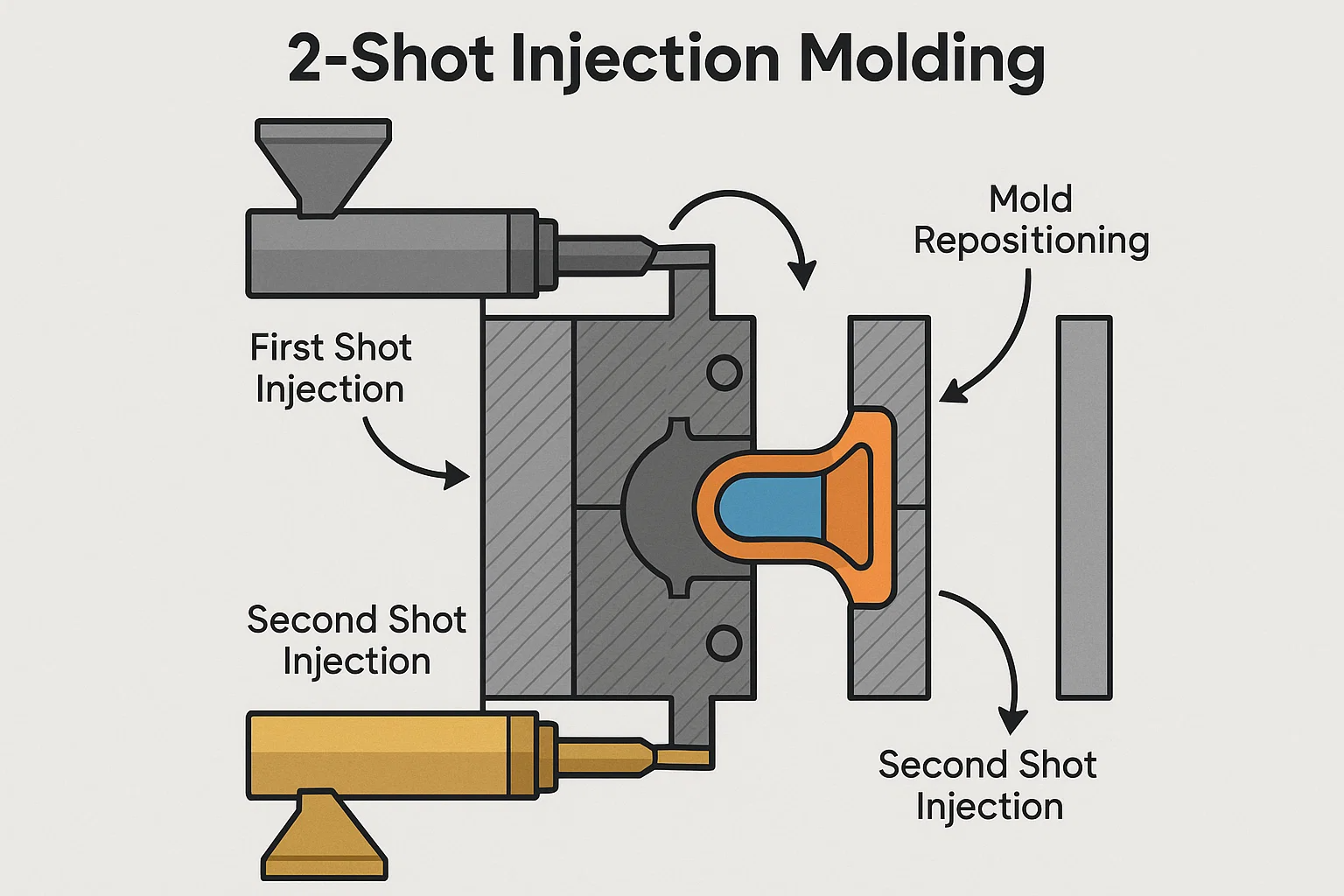 Övermoldning: Detta är en specifik teknik där ett andra material injiceras över en befintlig del ("substratet"). Medan 2-skottgjutning är en typ av övermoldning, kan termen också beskriva processer där substratdelen gjordes separat och sedan manuellt eller robotiskt placeras i en andra form för övermoldningssteget. Den viktigaste skillnaden är att i en riktig 2-skott-process formas båda materialen i följd inom samma maskincykel, utan att delen någonsin lämnar maskinen.