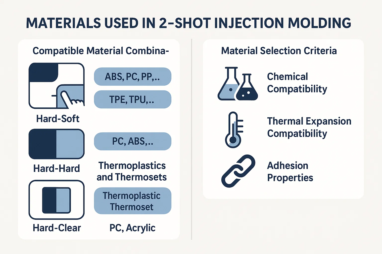 Framgången för alla injektionsprojekt med 2 skott hänger på ett noggrant urval av material. De två polymererna får inte bara uppfylla de funktionella och estetiska kraven i slutprodukten utan också vara förenliga med varandra för att bilda en stark, varaktig bindning. Det här avsnittet undersöker de typer av materialkombinationer och de kritiska kriterierna för att välja dem.