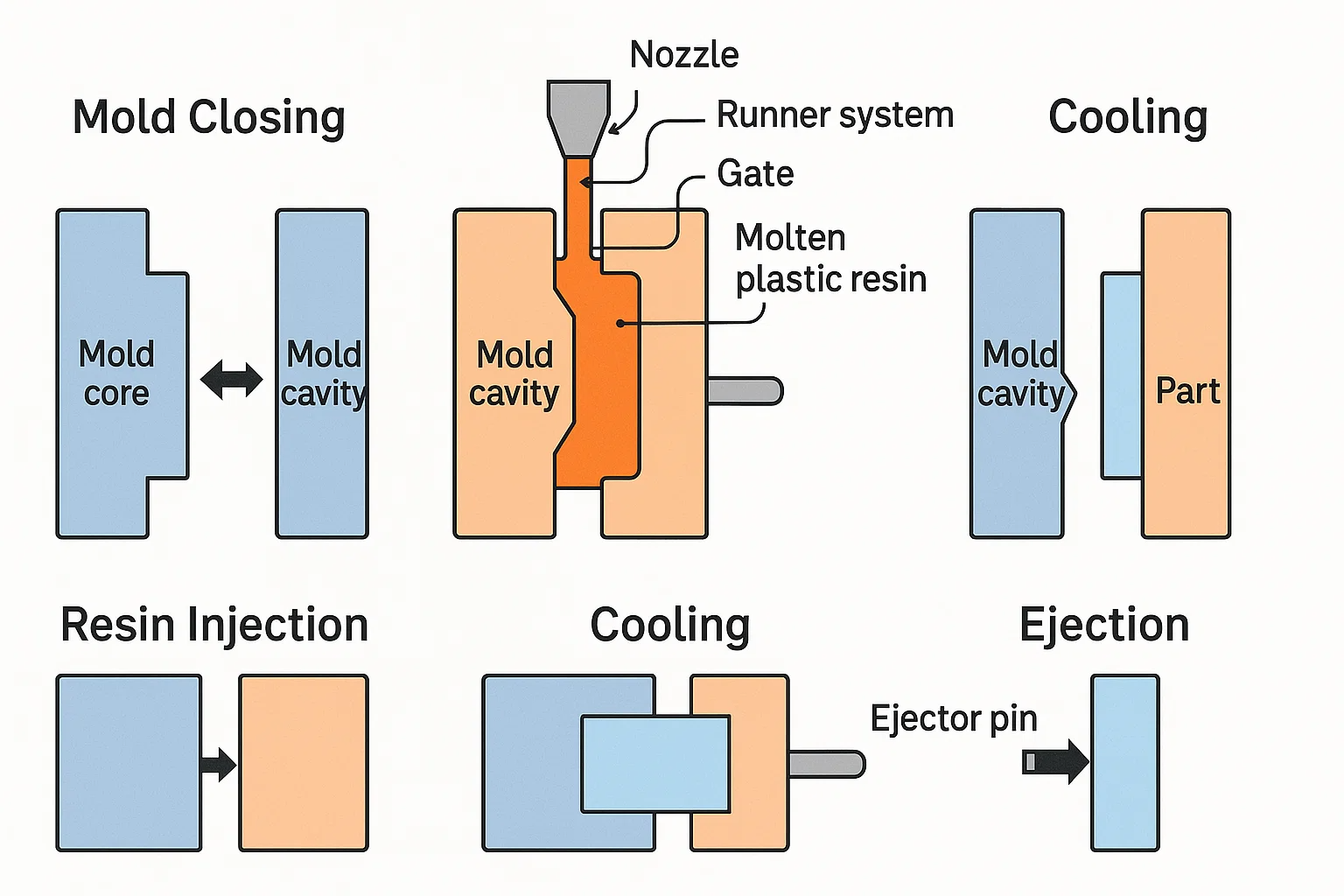 Mögelstängning: Processen börjar med att mögelkärnan och mögelhålan rör sig mot varandra tills de klämmer ihop. Denna åtgärd skapar det förseglade inre tomrummet - formen på den sista delen. Noggrannheten i denna justering är kritisk, eftersom varje felanpassning kan orsaka a "flash" (Överskottsmaterial som sipprar ut längs avskedslinjen).