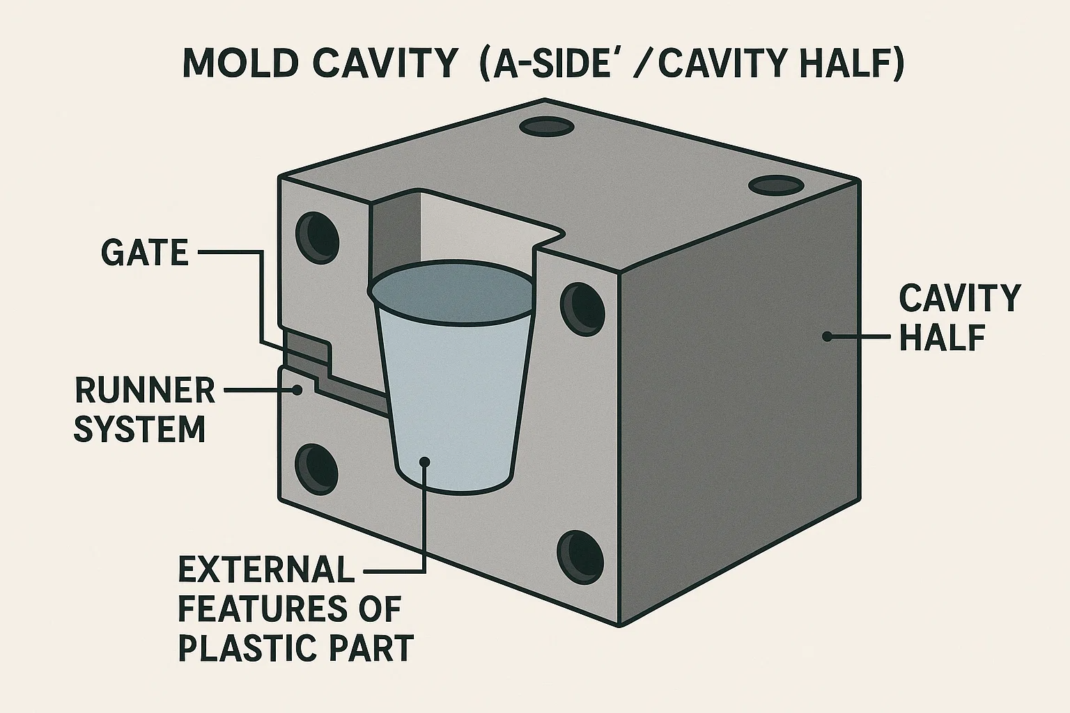 De mögelhålrum , även känd som "En-sidan" eller "kavitetshalv", är komponenten som bildar externa funktioner av plastdelen. Det är det yttre skalet eller behållaren som den smälta plasten fylls. Med hjälp av plastkoppsanalogin skulle kaviteten bilda utsidan av koppen, inklusive dess läpp och ytterväggar.