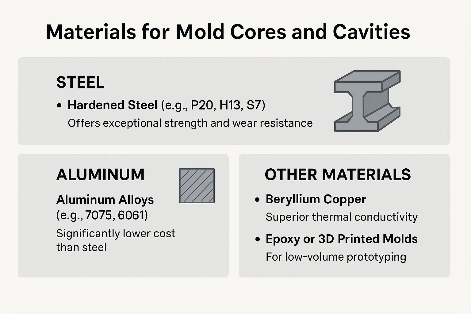 Det material som valts för formkärnan och hålrummet är kritiskt, eftersom det direkt påverkar formens hållbarhet, kostnad och förmåga att producera högkvalitativa delar effektivt. Valet beror på faktorer som den typ av plast som formas, den nödvändiga produktionsvolymen och komplexiteten i delkonstruktionen.