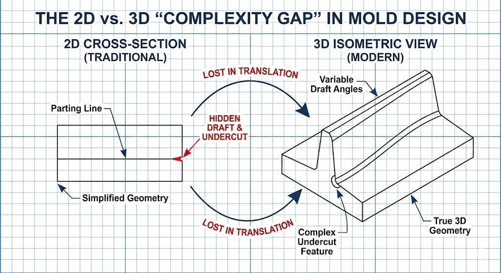 Traditionell formdesign börjar vanligtvis med 2D-layouter som definierar avskiljningslinjen, portplatser och kylkanaler. Men att översätta dessa platta representationer till ett tredimensionellt fysiskt objekt introducerar flera kritiska flaskhalsar: