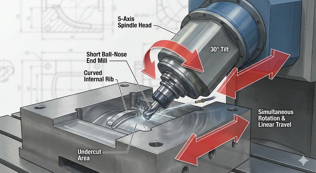 5-axlig skärning är en subtraktiv tillverkningsprocess där en CNC-maskin flyttar ett skärverktyg eller ett arbetsstycke över fem olika axlar samtidigt. In formdesign Med denna teknologi kan spindeln hålla sig vinkelrät mot komplexa, krökta ytor, vilket möjliggör skapandet av djupa håligheter, branta väggar och invecklade underskärningar som är fysiskt omöjliga att nå med standard 3-axlig utrustning.